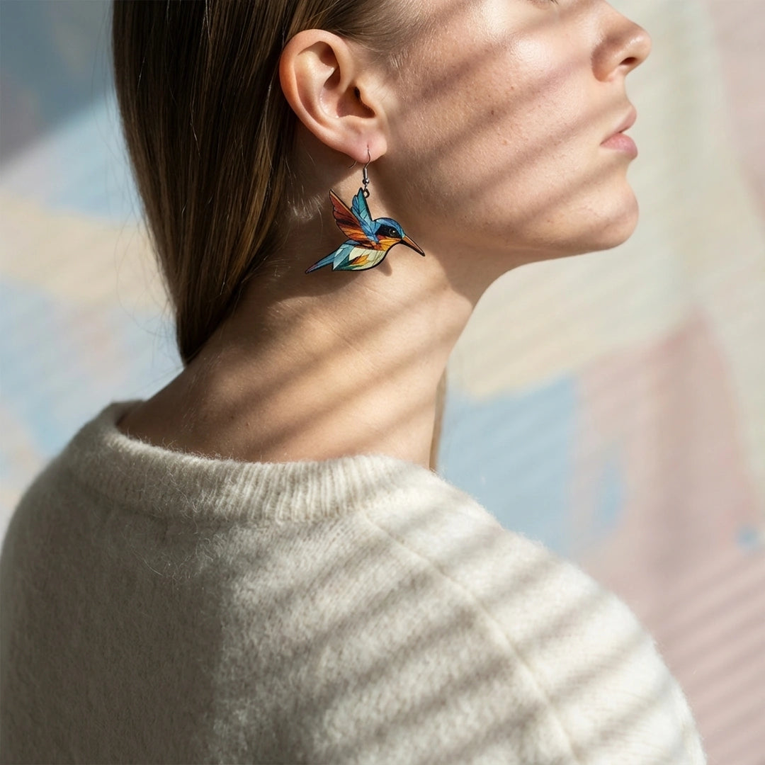 Anna korvillesi siivet! Nämä upeat, moniväriset kolibrikorvakorut ovat valmistettu kevyestä kotimaisesta puusta ja viimeistelty korkealaatuisella painatuksella.
