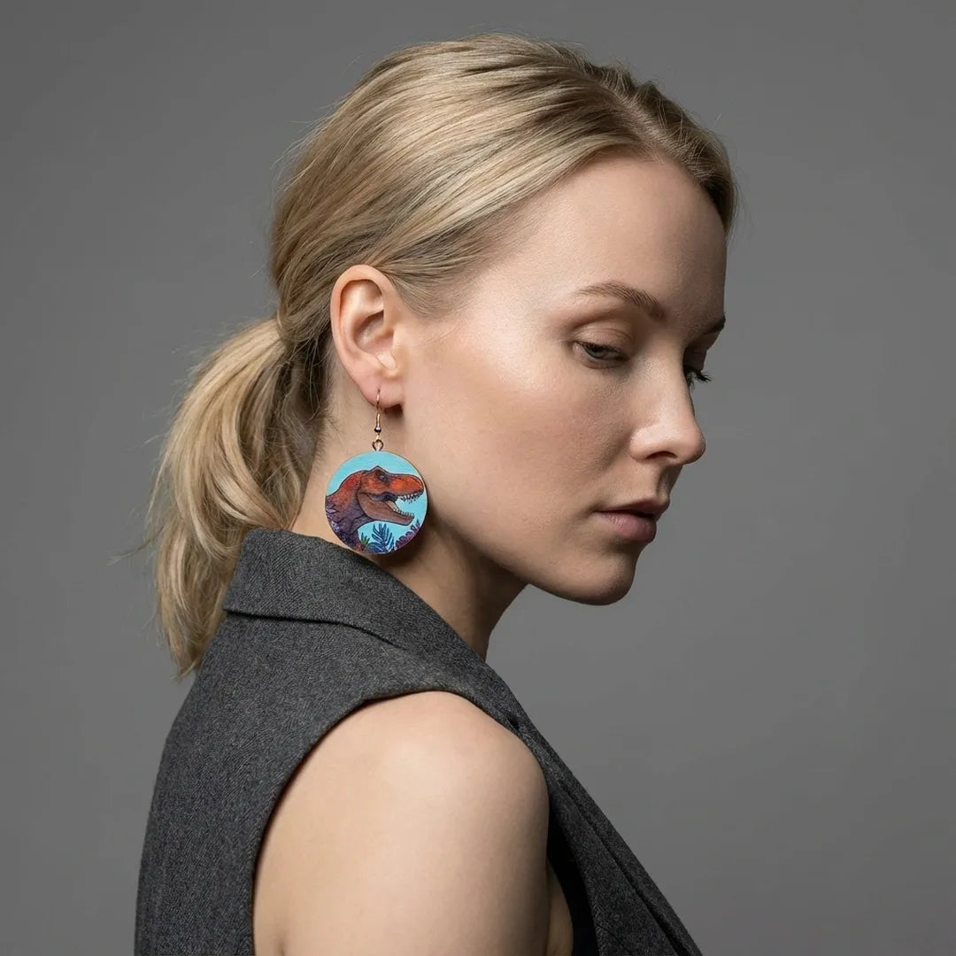 Kun T. rex kohtaa trooppisen pastellisävyn, syntyy look, joka ei pyydä anteeksi. Näissä näyttävissä puukorvakoruissa yhdistyvät muinaisten petojen voima ja leikkisä värikkyys – täydellinen valinta rohkealle tyyliniekalle, joka rakastaa kontrasteja ja katseita. Kevyet korut, mutta asennetta tonnien edestä.