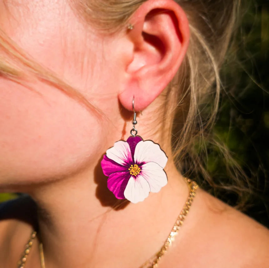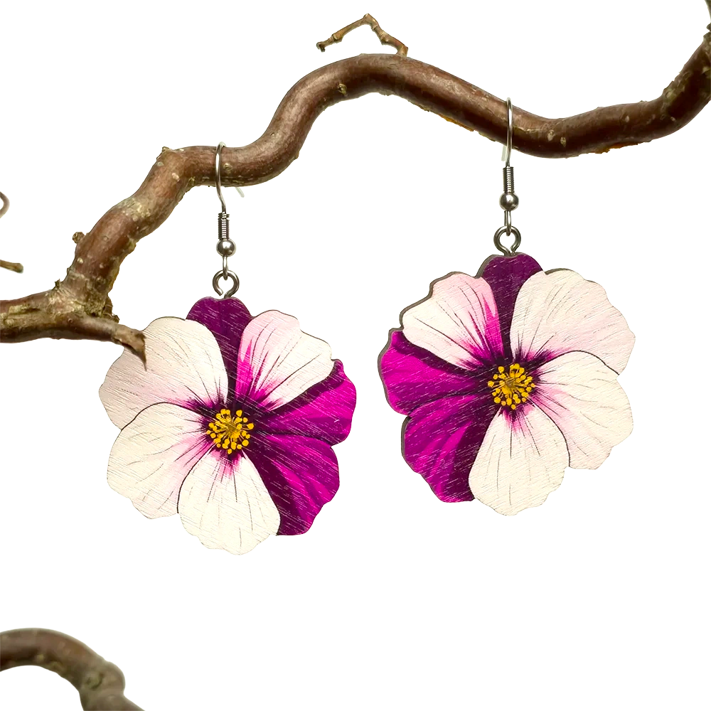 Kevyttä kauneutta jokaiselle päivälle. Viola-korvakorut hurmaavat pehmeällä violetin ja luonnonvalkoisen sävyjen liitolla, kuin käsin maalattu muisto kesäisestä kukkapellosta. Kukka on leikkisä mutta tyylikäs – täydellinen lisä asuun, kun haluat tuntea olosi itsevarmaksi, kevyeksi ja kauniiksi. Valmistettu kotimaisesta vanerista, keveydestä tinkimättä tyylistä.