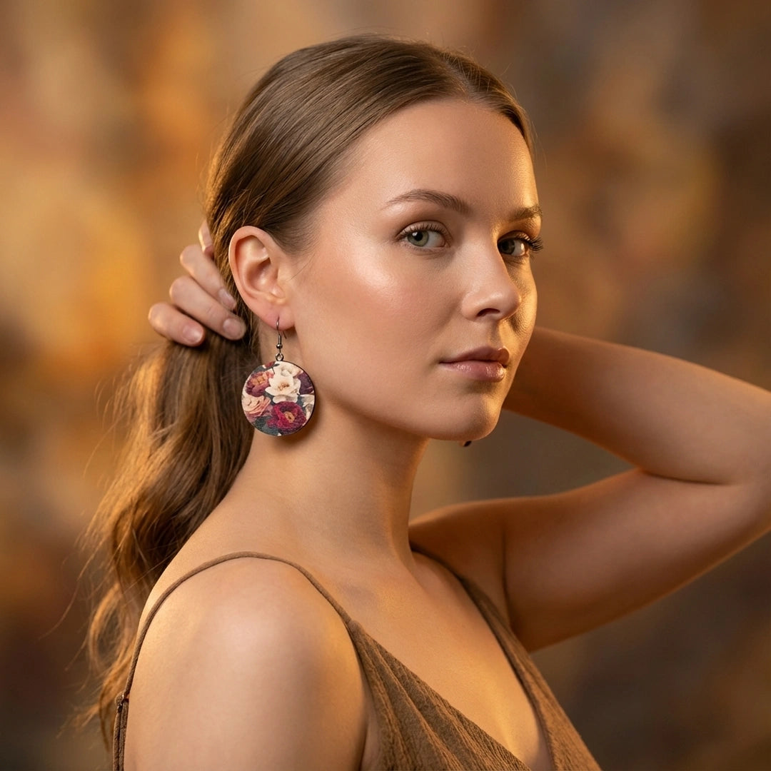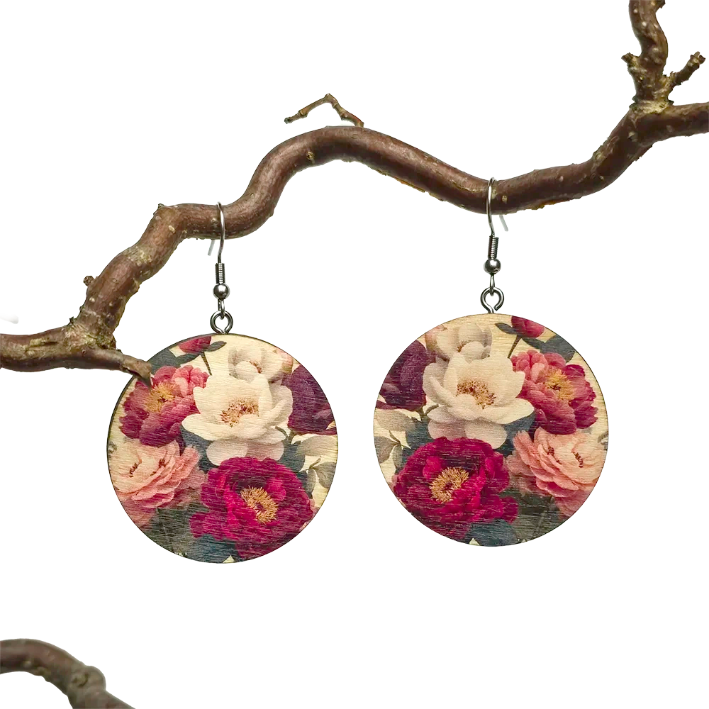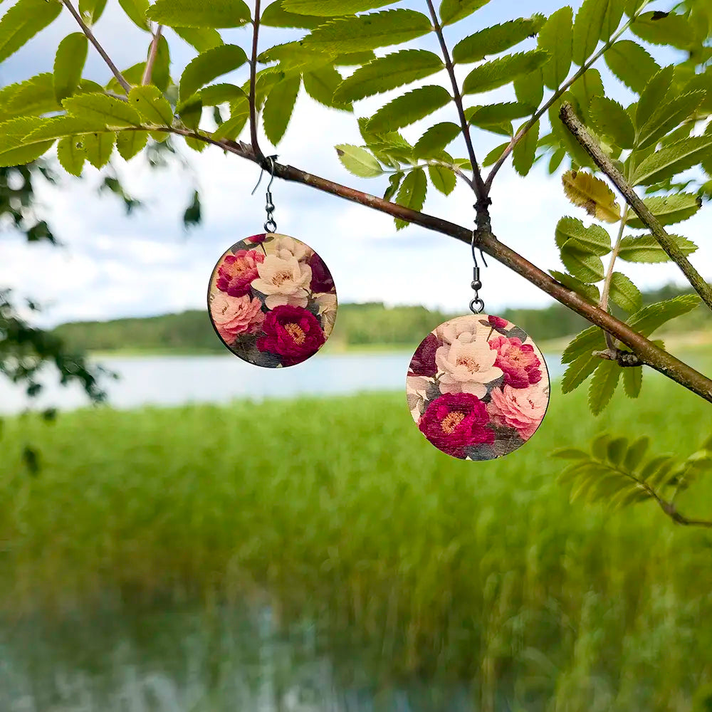 Kuin tuulahdus vintage-unelmaa – nämä puukorvakorut huokuvat pehmeää eleganssia ja klassista kauneutta. Kukallinen kuosi on painettu kotimaiselle vanerille, jonka lämmin pinta tuo kuvitukseen herkän, tekstiilimäisen tunnelman. Täydellinen valinta, kun haluat korusi kertovan tarinaa – lempeästi, mutta näyttävästi.