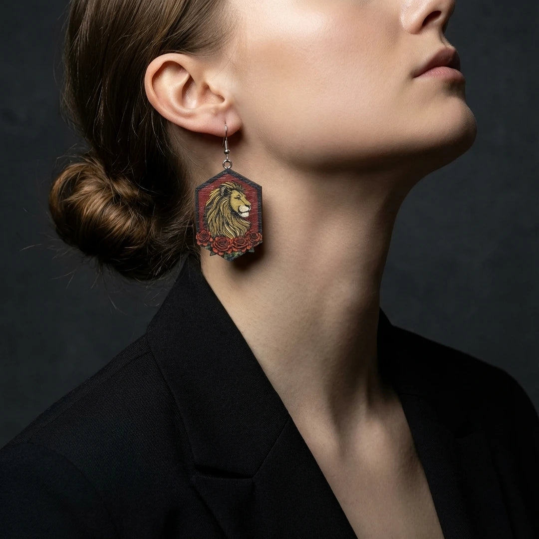 Vapauta sisäinen voimasi. Nämä leijona-aiheiset korvakorut ruusuineen symboloivat voimaa, rohkeutta ja jaloutta. Erinomainen tapa ilmaista itseäsi ja kantaa mukanasi merkityksellistä taidetta.