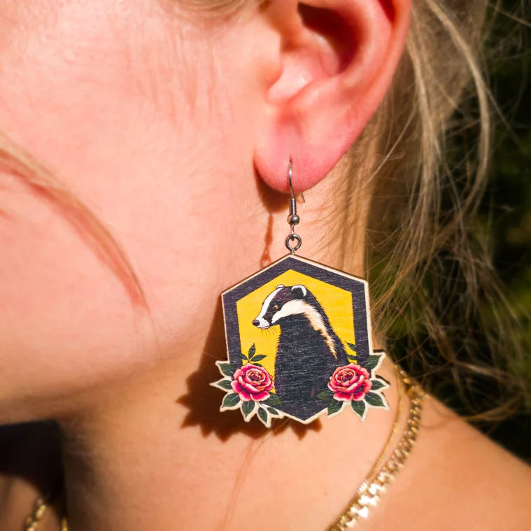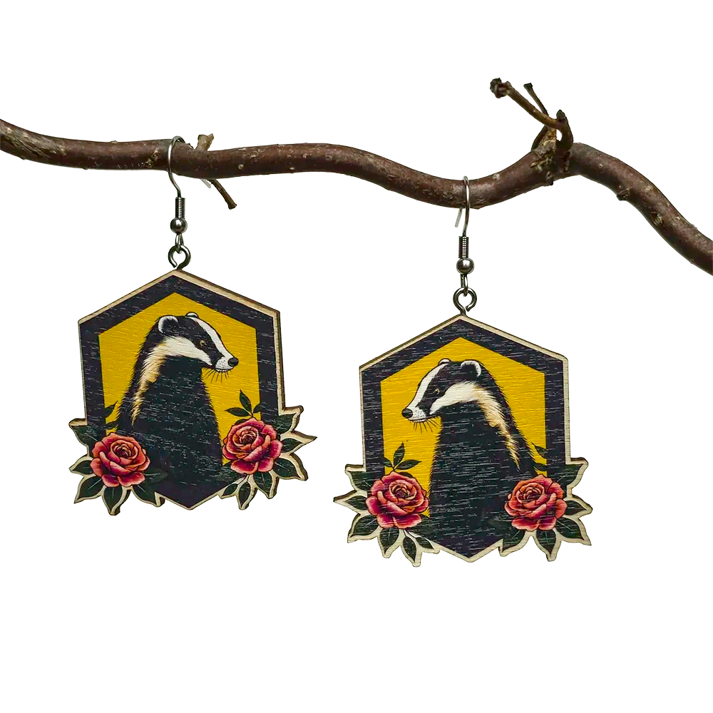 Ylväs mäyrä seisoo tarkkana kuin metsän vartija – ja sen ympärillä kukkivat ruusut kuin kruununa. Mäyräherra-korvakorut ovat täydellinen yhdistelmä voimaa ja herkkyyttä, valmistettu kotimaisesta vanerista ja viimeistelty ainutlaatuisella printtikuosilla. Näissä koruissa on tarina – ja sinä voit kantaa sen mukanasi.