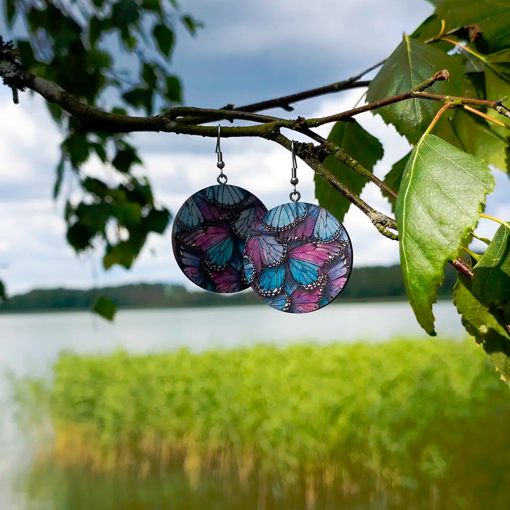 Siipisumu on kuin hiljainen parvi perhosia, jotka leijuvat korviesi ympärillä. Violetin ja turkoosin sävyt kimaltelevat pehmeästi, muodostaen elävän pinnan joka muuttuu valon mukana. Näissä korvakoruissa yhdistyy keveys, runollisuus ja ripaus taikaa – täydelliset silloin kun haluat tuntua kevyeltä ja vahvalta yhtä aikaa.